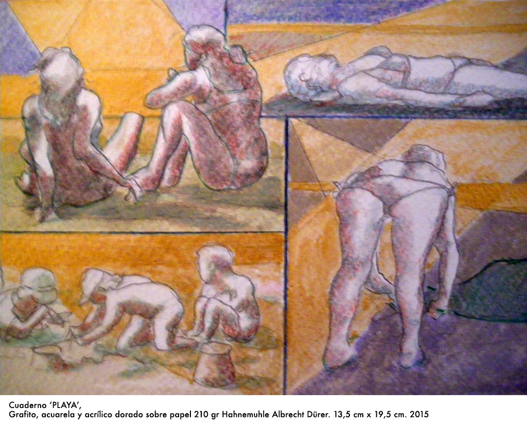 Cuaderno 'PLAYA'. Trece páginas con dibujos del natural tomados en la playa, formando un mosaico de imágenes.
